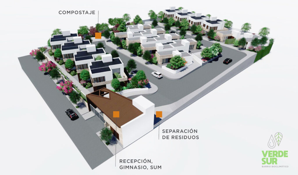 - Innovador sistema de reutilización de agua de cada vivienda para la parquización general. Compostaje urbano y separación de residuos.
