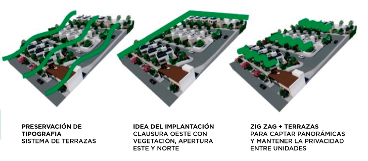 Las tipologías de 120 m2 con patios arbolados filtran los vientos predominantes de la zona, para favorecer al complejo.